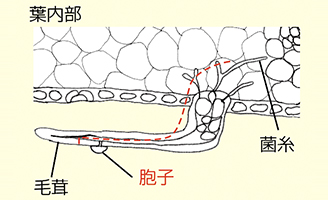 ●樹上の葉の病斑上に菌糸で越冬